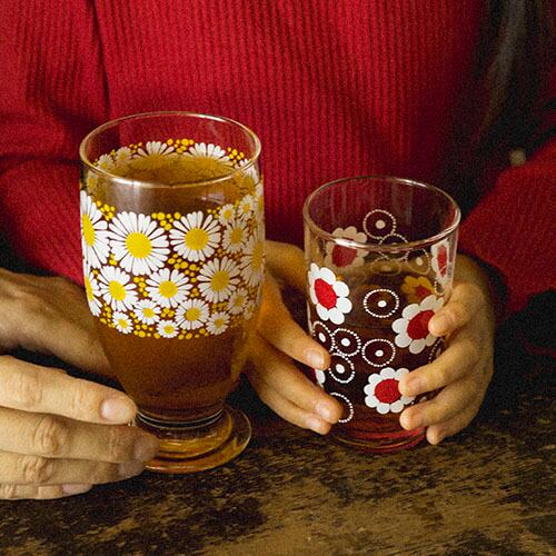 アイスクリームをトッピングしたクリームソーダの可愛らしさは、このグラス抜きには語れないほど愛おしく感じていただけるはずです。昭和当時のデザインを大切にするために、柄のにじみやズレ、シールひとつにもこだわって作られています。